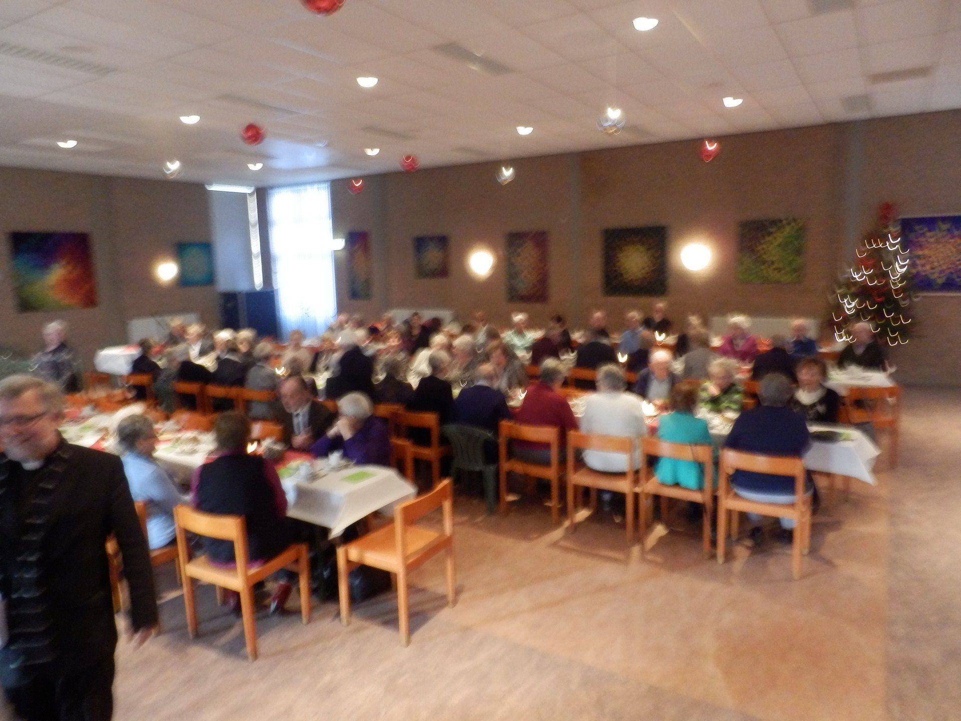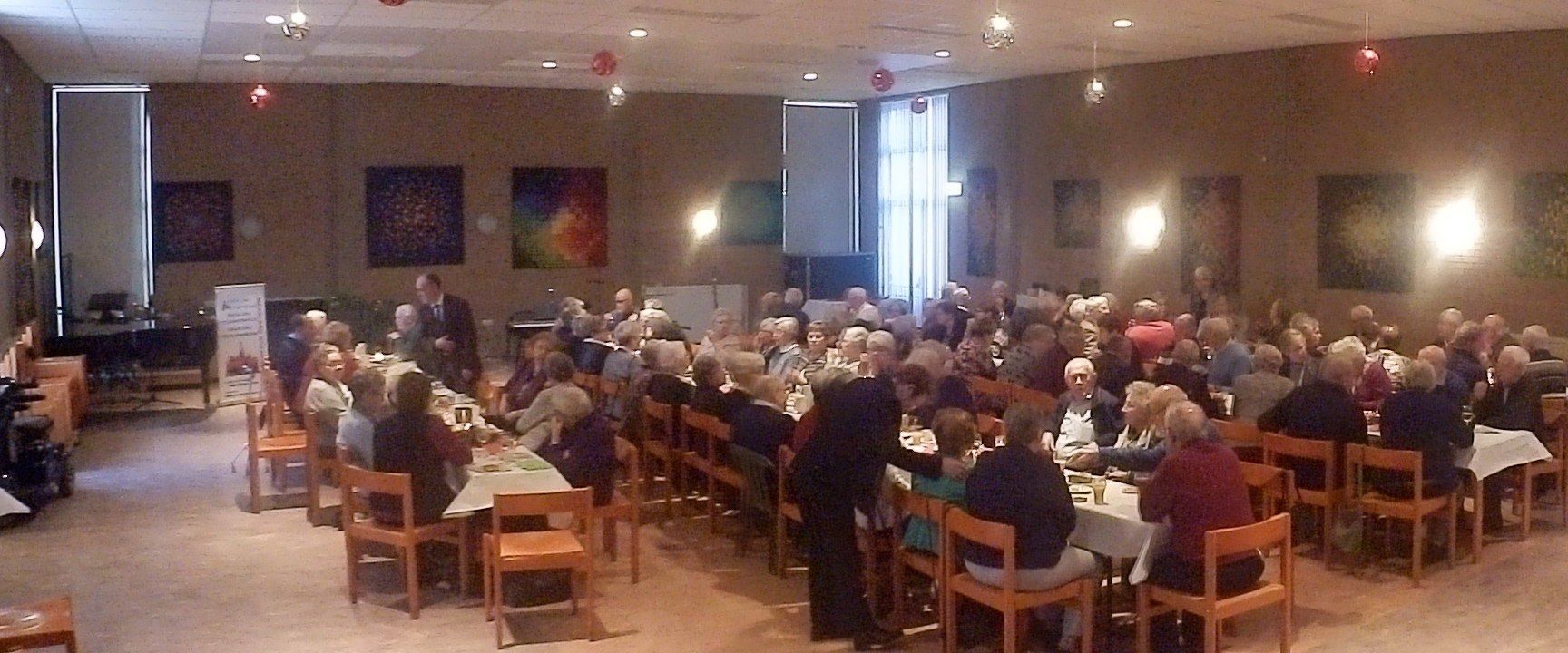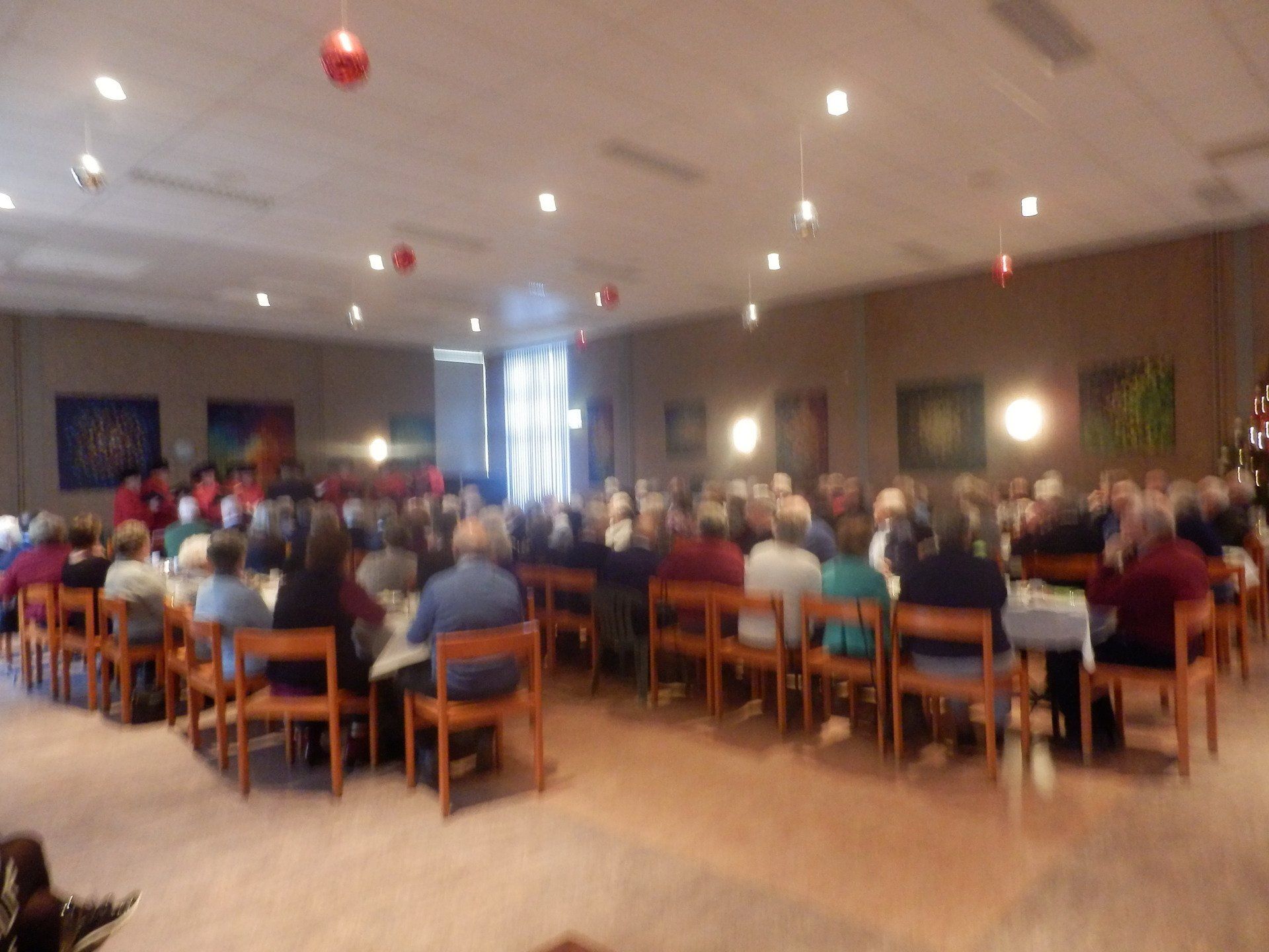 De organisatie kon voor 110 personen de tafels dekken. Het zag er feestelijk uit. Alles was in kerstsfeer gedekt en de harmoniezaal was sfeervol verlicht en er pronkte een mooie kerstboom.