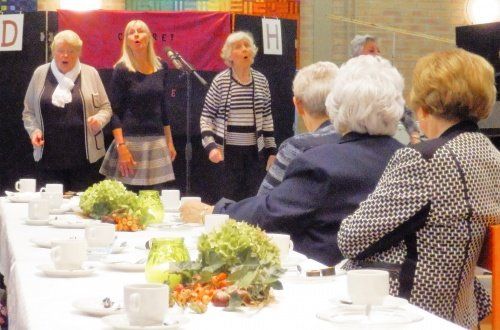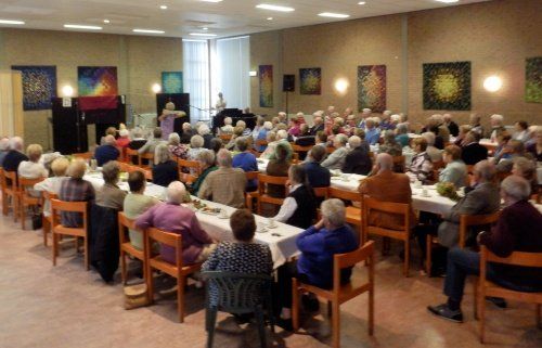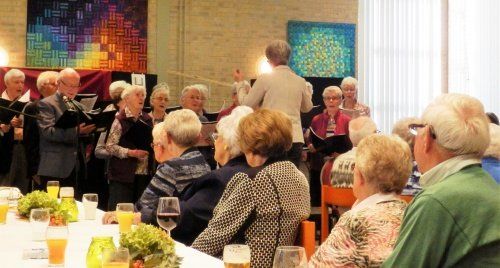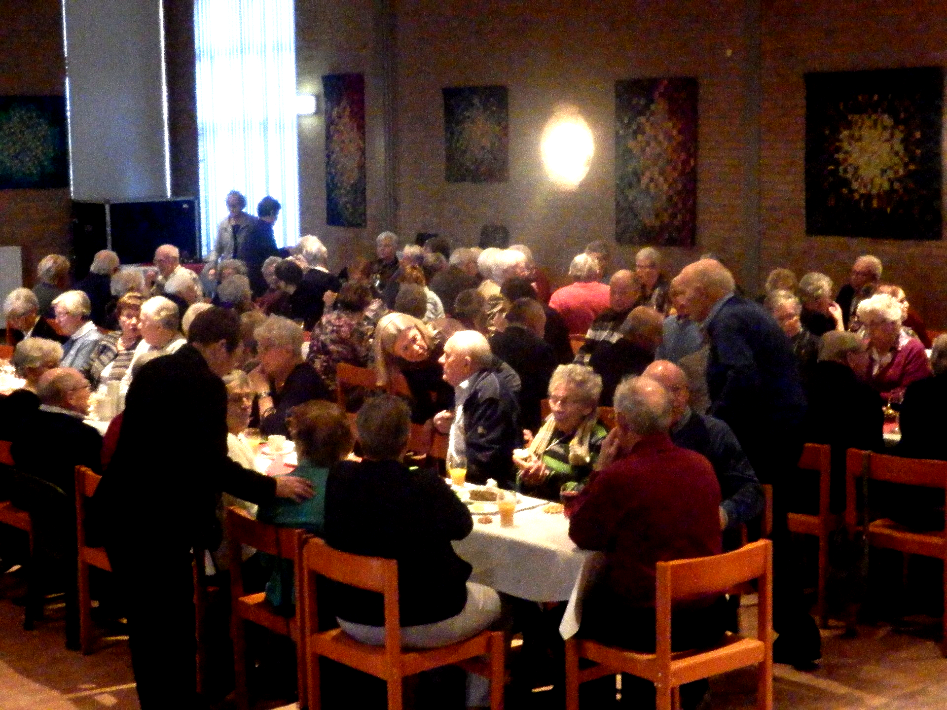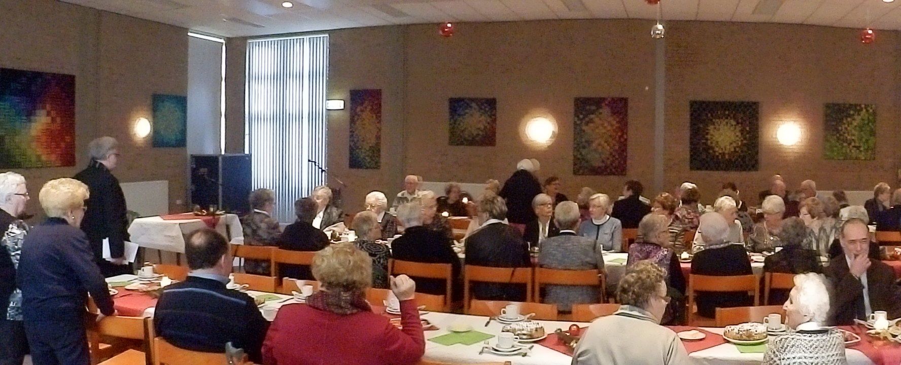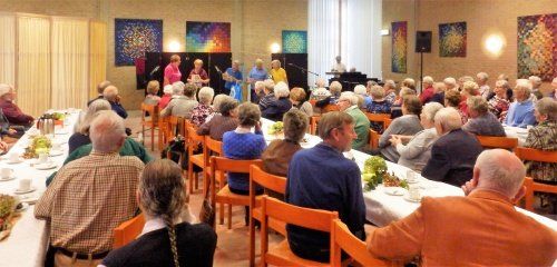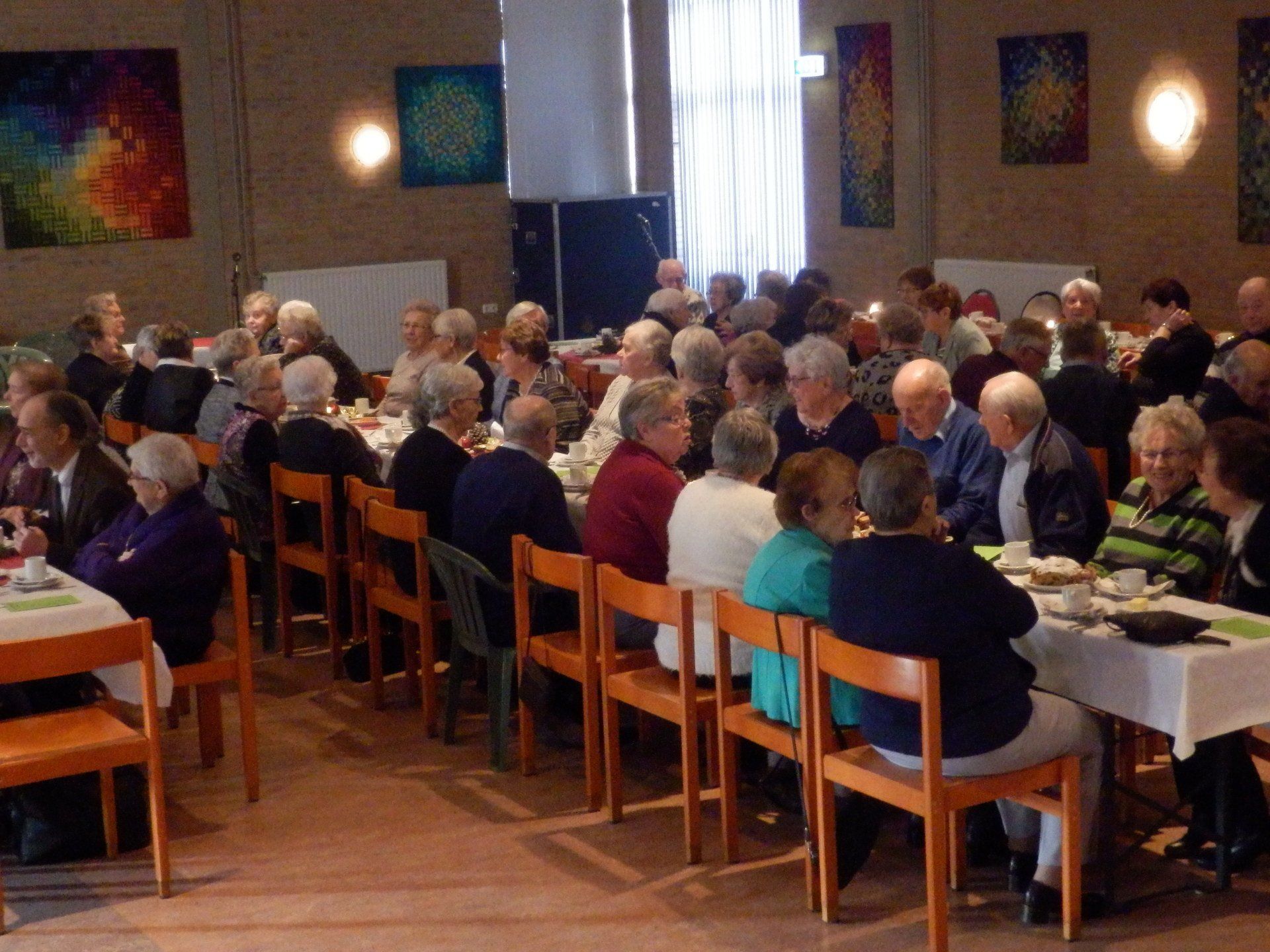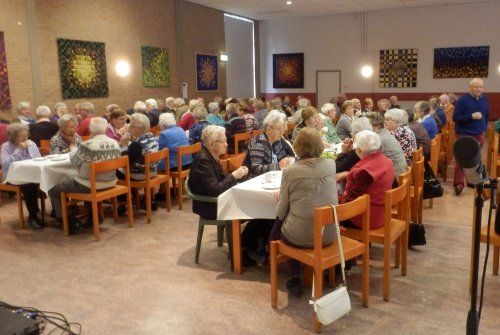 Donderdag 13 oktober was het dan zover. De vakantie ligt al voor velen achter ons. De herfst heeft zijn intrede gedaan en het is tijd om gezellig samen te zijn. De herfstversieringen op de gedekte tafels waren weer artistiek verzorgd door Annie van Birgelen. Onze leden konden genieten van een gezellige middag die verzorgd werd door Dames-Cabaretgroep de Kriekele uit Maastricht en door het Ouderenkoor onder leiding van Kitty Wolters. De Dames-Cabaretgroep Kriekele maken op bekende melodieen nieuwe teksten en die brengen ze ten gehore tijdens een sprankelend optreden. De sketches die ze laten zien zijn actueel en herkenbaar voor de toeschouwers. Het ouderenkoor nam ons mee op een reis door Duitsland, Oost Europa en weer terug naar Nederland om te eindigen op de Amsterdamse grachten waar we uitgenodigd werden om mee te zingen. Naast het genieten van zang – spel en muziek was er koffie,vlaai een drankje en een lekker hapje. Iedereen is rond de klok van 16.30u voldaan huiswaarts gekeerd.